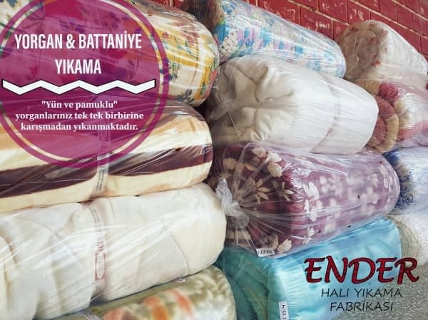 "Ender Halı Yıkama" diğer firmalardan farklı olarak fabrikamıza gelen yorgan ve battaniyelerinizi toplu olarak değil tek tek fırçalı temizleyerek daha sağlıklı ve hijyenik bir temizliğe kavuşturur. Bu yöntemle farklı adreslerden alınan yorgan ve battaniyelerin kirleri birbirine karışmadan ilk günkü temizliğine kavuşmuş olur. Yıkama işlemi;